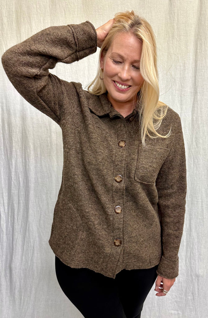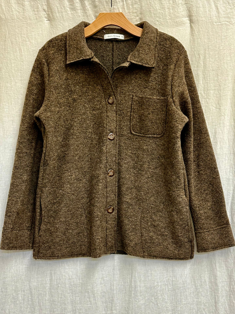 Our Boiled Wool fabric in a long sleeve, button down, single breast pocket, collared, double inset pocket, shirt style jacket. 60% Virgin Wool, 40% Polyester. As shown, available in Saddle, only.