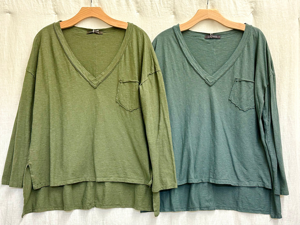 Our Cotton Linen Jersey fabric in a long sleeve, side slit, deep V-neck, high low, boxy, dropped shoulder, oversized, pullover top.70% Cotton, 30% Linen. Shown in Kelp, also available in Gull. Model is 5' 7" and is wearing size S. This style runs very loose and roomy, yet true to size.