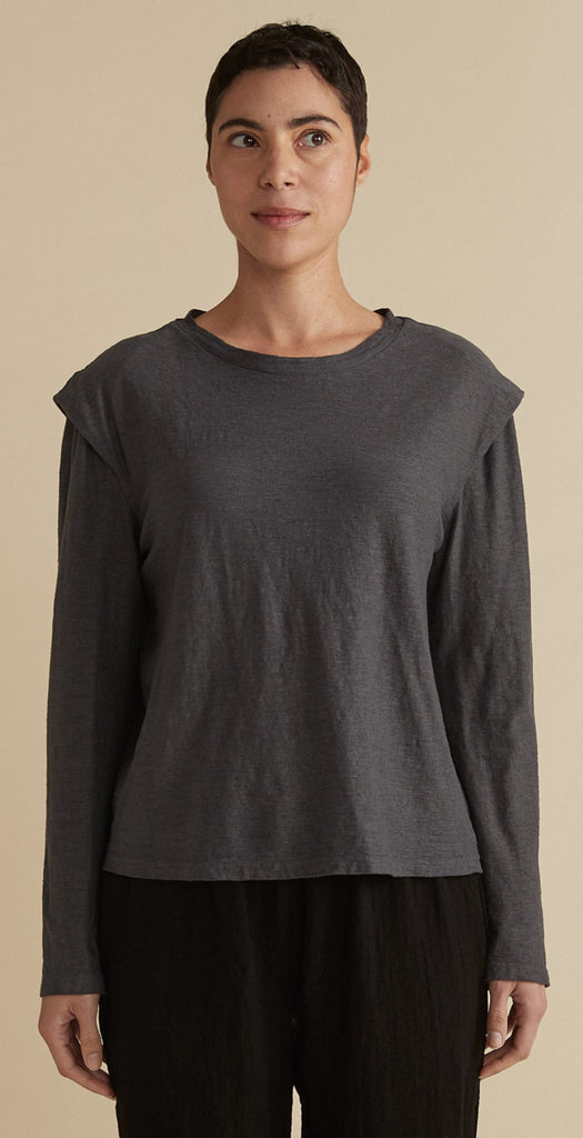 Our Cotton Linen Jersey fabric in a crew neck, long sleeve, cap sleeve shoulder detail, hip length pullover top. 70% Cotton, 30% Linen. As shown, available in Gull only. Model is 5' 10" and is wearing size M. This style runs slightly loose yet true to size.