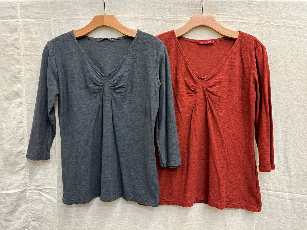 Our Cotton Linen Jersey fabric, in a V-neck, 3/4 sleeve, fitted, hip length, tee. 70% Cotton, 30% Linen. Shown in Mulberry (Sold Out), only available in Gull and Cognac. Model is 5' 10" and is wearing size M. This style runs slightly loose, yet true to size.