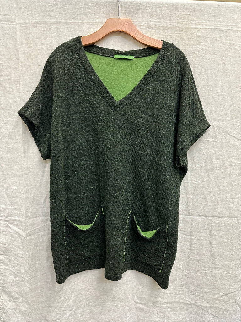 Our Charcoal Double Cloth fabric in a half sleeve, v-neck, double front pocket, pullover tunic. 25% Poly, 50% Cotton, 25% Rayon. As shown, available in Verde only. Model is 5' 7" and is wearing size S in Tidal (Sold Out) This style runs loose and roomy.
