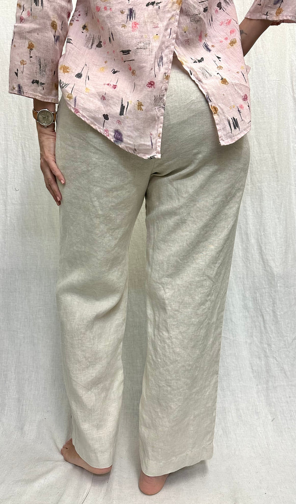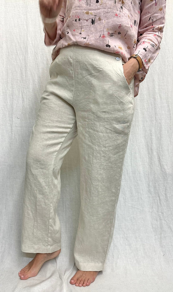 Our Mid-weight Linen in a Sailor style front side button, double inset side pocket, straight leg, full length, pant. Shown in Jicama, also available in Coconut. 100% Linen. Model is 5' 7" and is wearing size L. This style runs on the smaller side throughout.