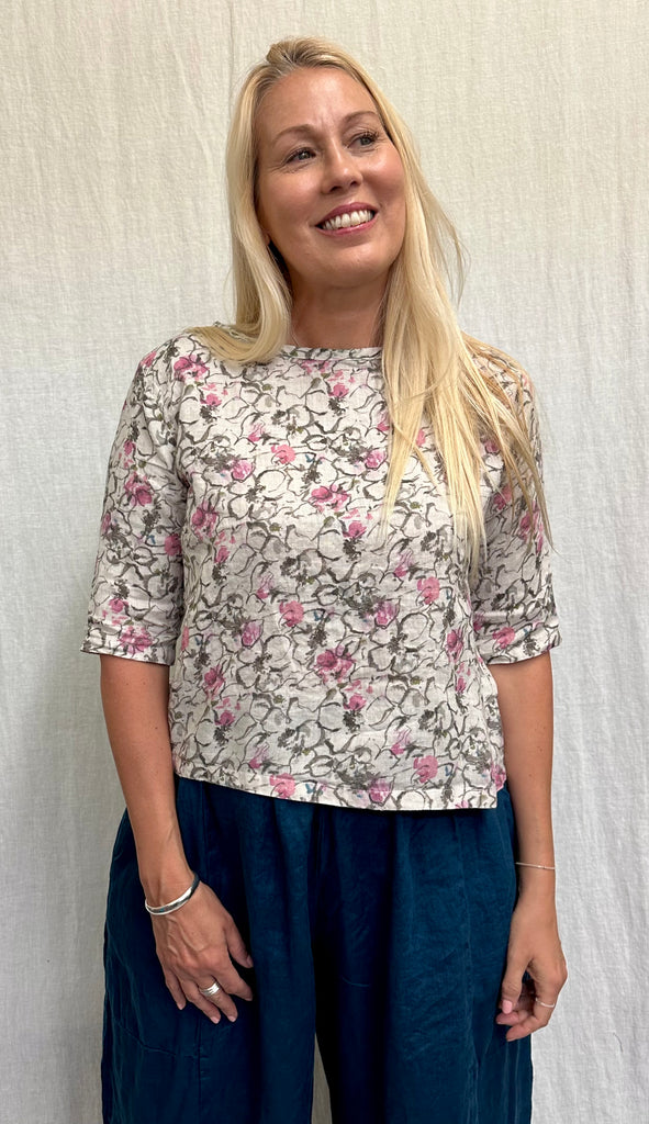 Our lightweight Hanky Linen Cosmos Bouquet in a scoop neck, half sleeve, boxy pullover crop top. 100% Linen. Shown in Jicama, also available in Anthracite. This style runs ever so slightly loose, yet the fit is true to size.