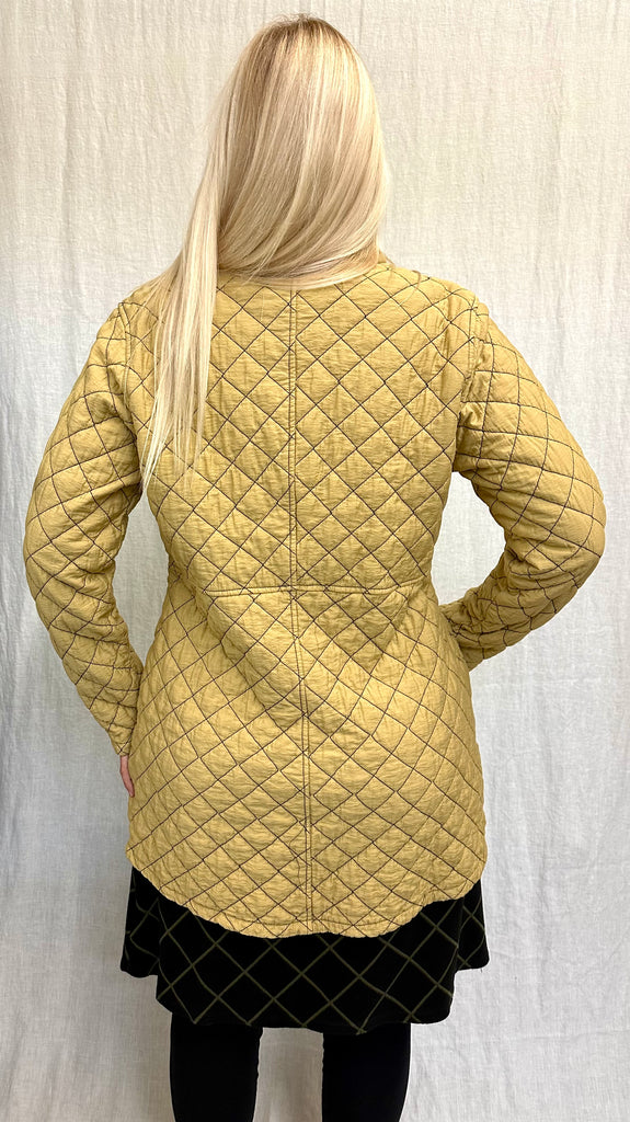 Our Quilted Parachute fabric in a long sleeve, Mandarin collar, darted seam detail, double front pocket, double zipper, mid thigh length, jacket. 84% Rayon, 16% Nylon. Shown in Mustard Seed, also available in Succulent. Model is 5' 7" and is wearing size S. This style runs slightly roomy yet true to size.