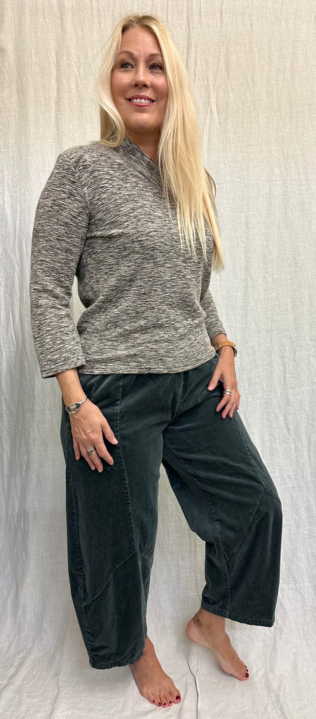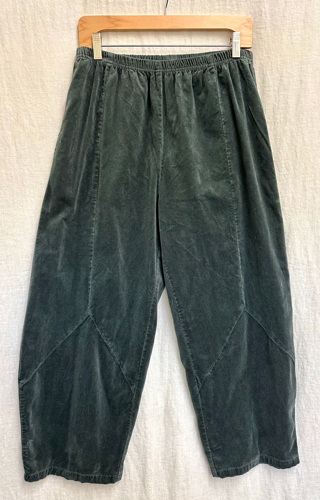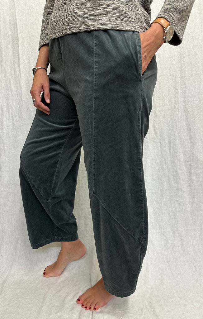 Our Soft Cotton Velvet fabric in an elastic waist, double inset pocket, seam detail, above the ankle, barrel style crop pant. 84% Cotton, 16% Tencel. As shown, available in Gull only. Model is 5' 7" and is wearing size M. This style runs very true to size.