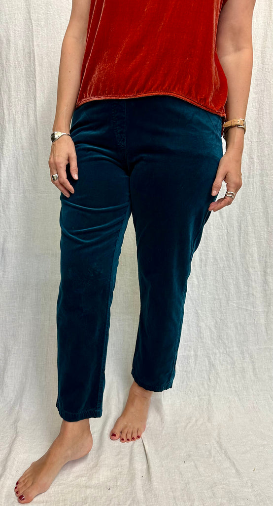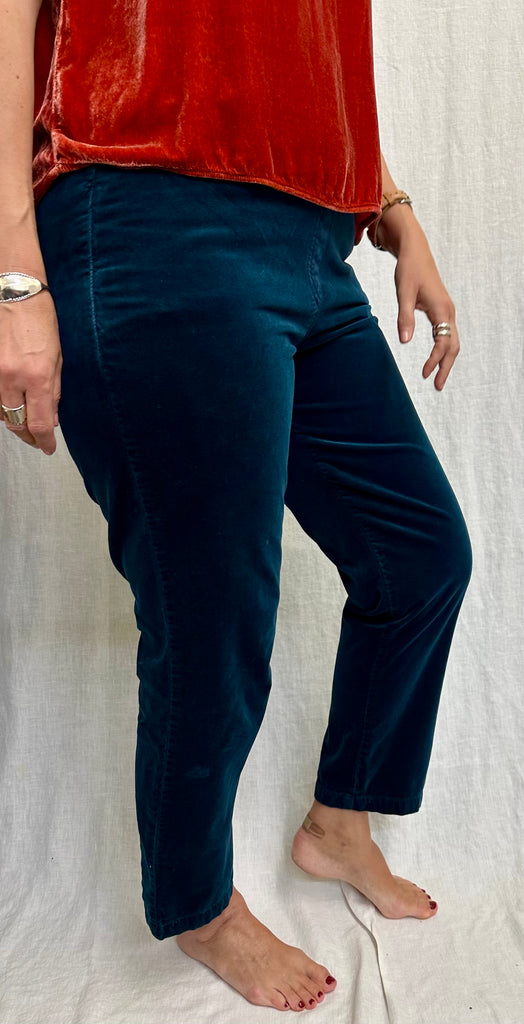 Our Soft Cotton Velvet fabric in an elastic waist, flat front, double inset pocket, ankle length, straight leg pant. 84% Cotton, 16% Tencel. As shown, available in Peacock only. Model is 5' 7" and is wearing size M. This style runs slightly loose, yet true to size.