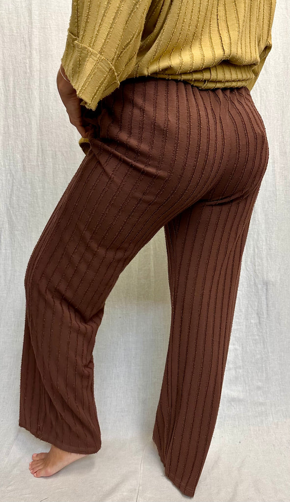 Our Viscose Frayed Stripe fabric in an elastic waist, inset pocket, wide leg, pull on pant. 86% Viscose, 8% Poly, 6% Elastane. Shown in Cola, also available in Etan (Dark indigo blue) Model is 5' 7", This style runs true to size.